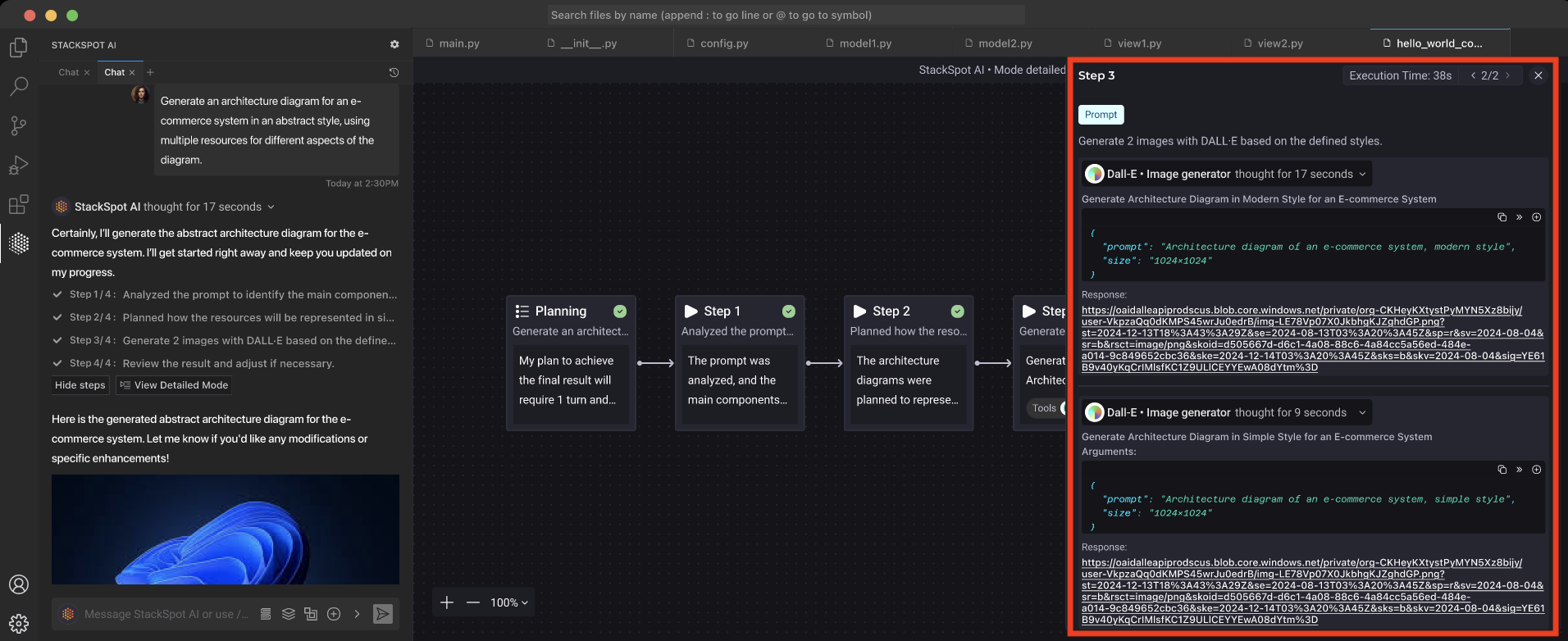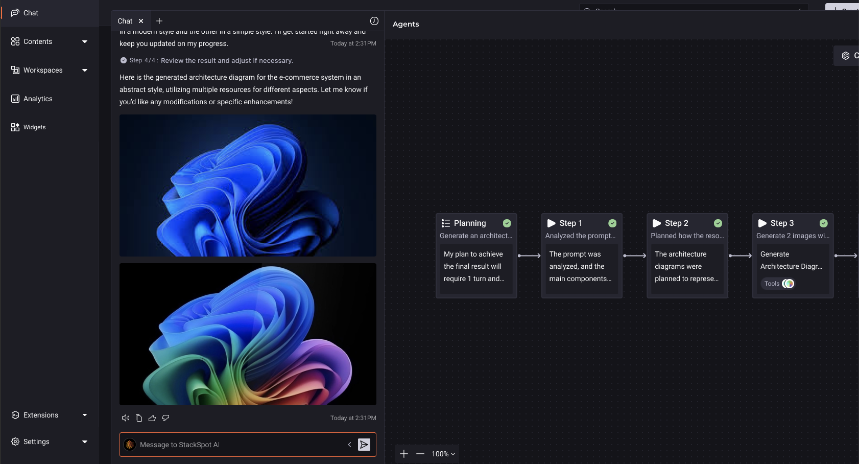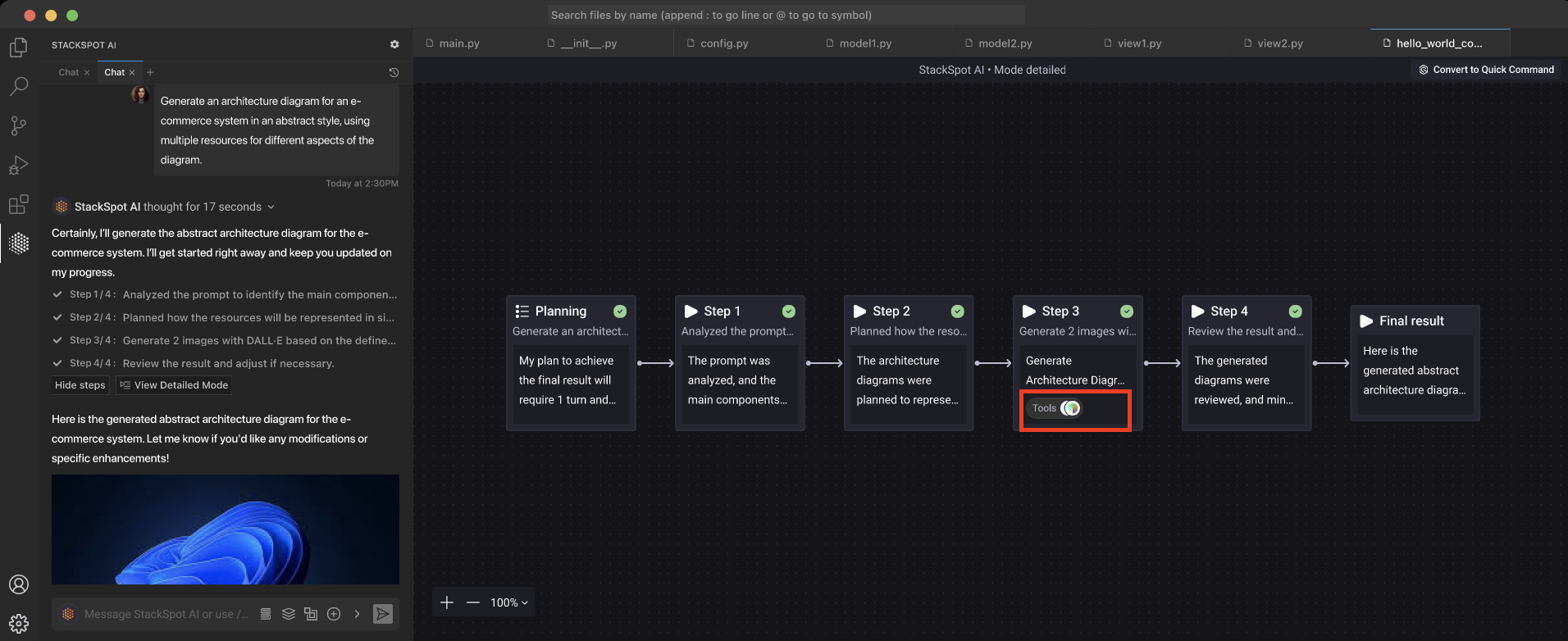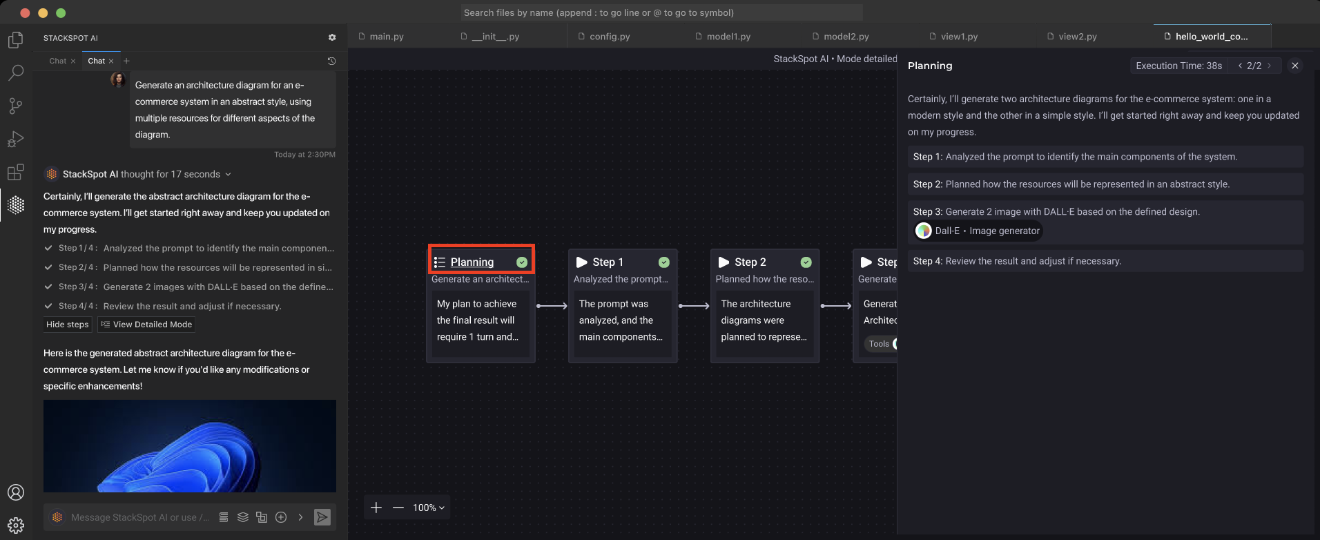 - Você pode clicar em 'Planning' para obter mais informações sobre o que o Agente planejou em cada etapa, incluindo as Tools usadas para gerar imagens ou responder perguntas sobre tópicos específicos.