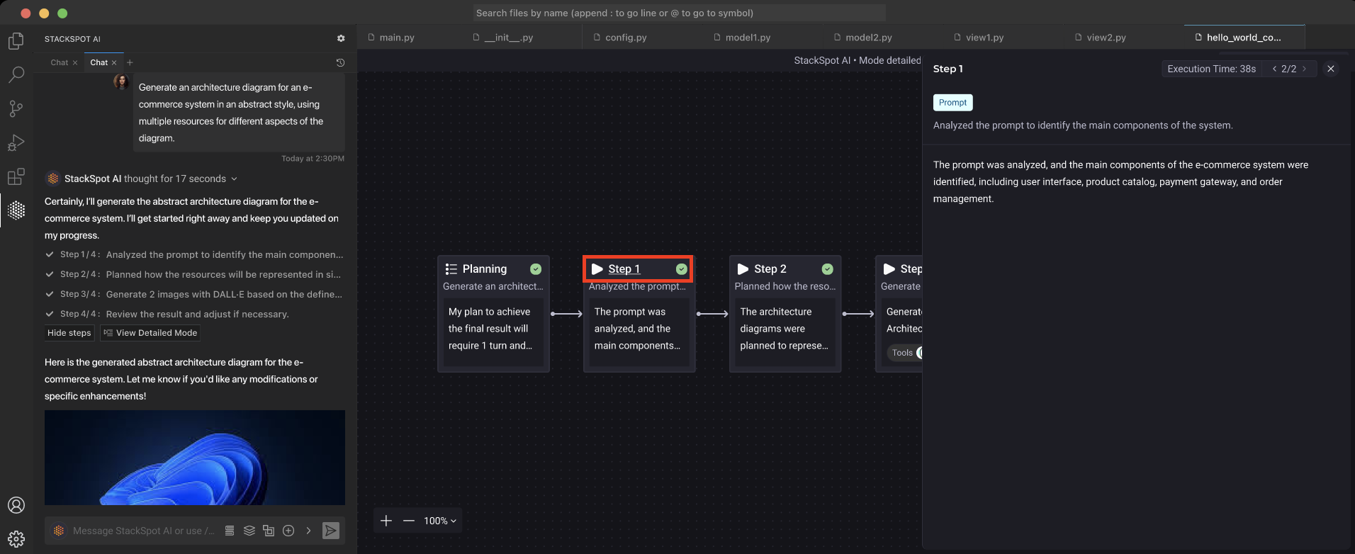 Quando você enviar um prompt, a StackSpot AI irá processar e raciocinar. Você pode clicar nele para ver o que o LLM (Large Language Model) está pensando. Em seguida, serão exibidos os passos de planejamento do Agente.