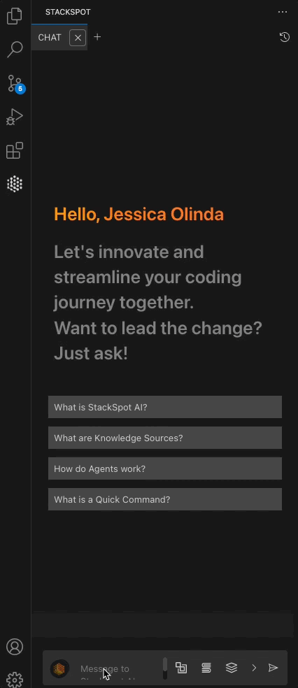 StackSpot Flex é um Agente versátil projetado para lidar com uma ampla gama de tópicos e tarefas de maneira geral. Ele fornece o máximo de contexto para interação e é altamente flexível, permitindo que você configure e personalize o contexto do chat conforme necessário. Ele garante conversas práticas e contextuais durante o desenvolvimento de software.