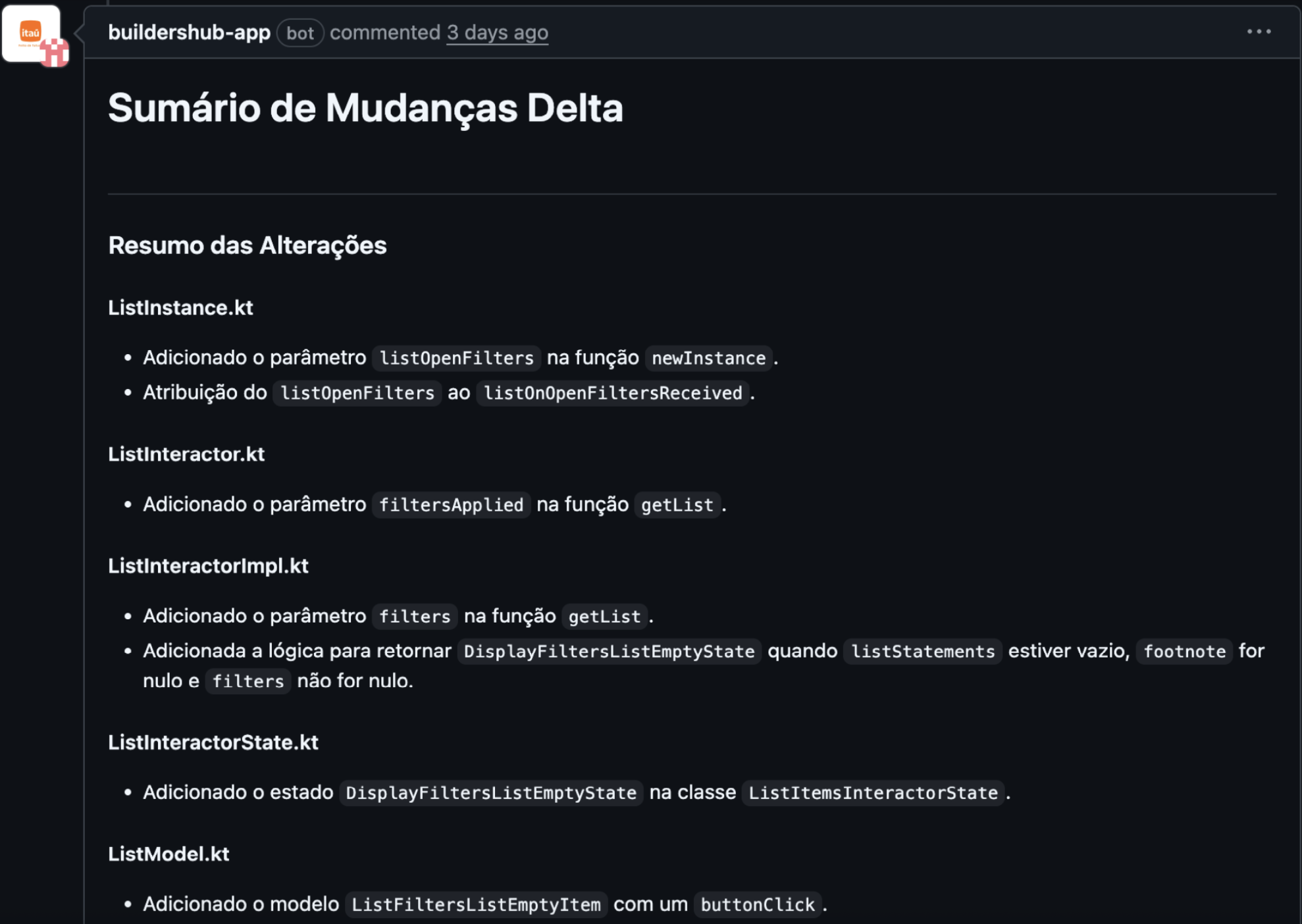A StackSpot AI cria um Changelog automático como comentário no seu Pull Request. Esse resumo é feito a partir do comando git diff, mostrando tudo o que foi alterado, removido ou adicionado no seu código. Assim, você consegue conferir as mudanças feitas em cada arquivo envolvido no Pull Request.