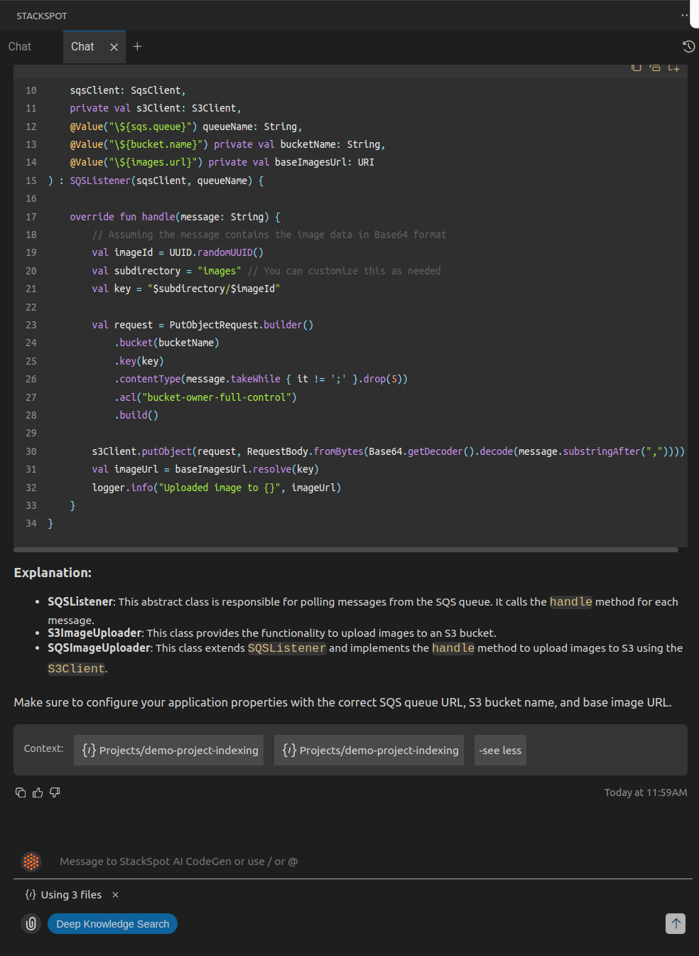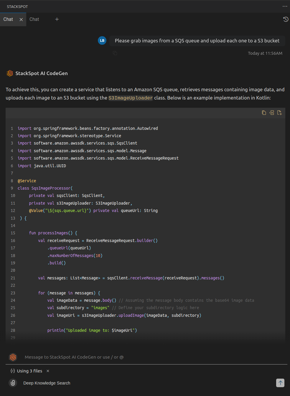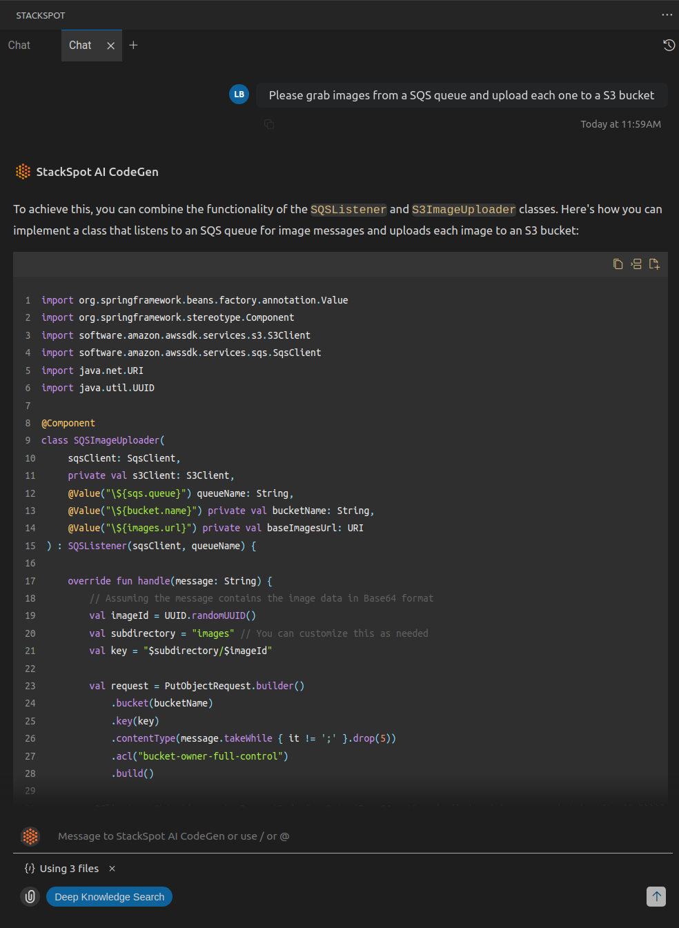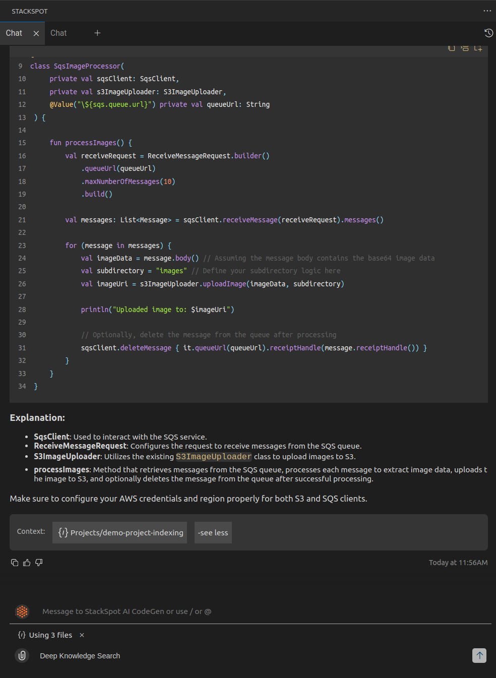 Neste modo, a StackSpot AI analisará os arquivos mais recentes usados na sua IDE. Se você fizer alterações nas abas abertas, elas serão processadas em segundo plano para fornecer soluções personalizadas para o seu projeto.