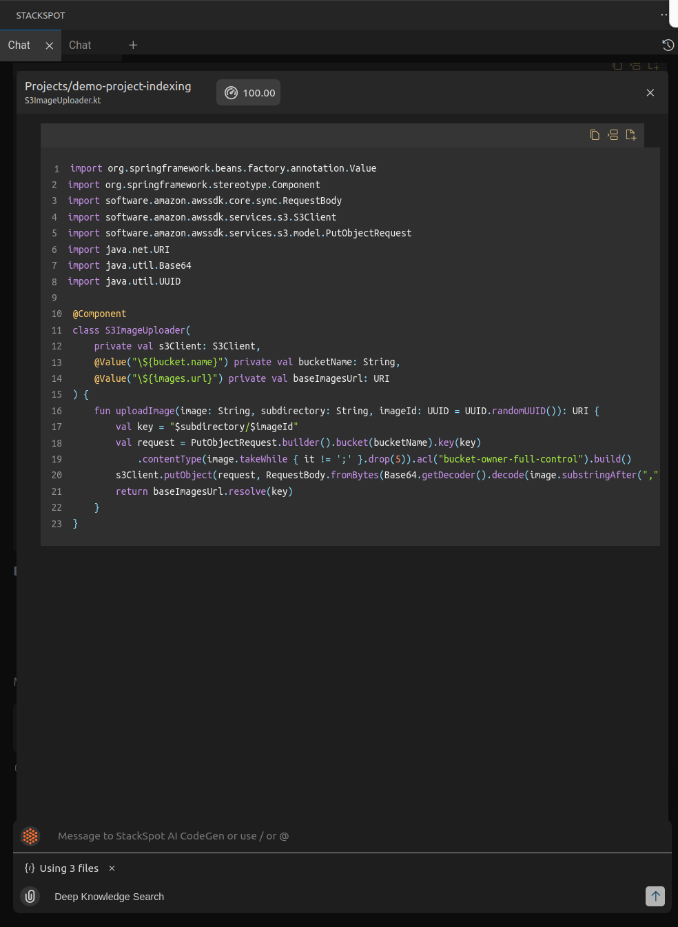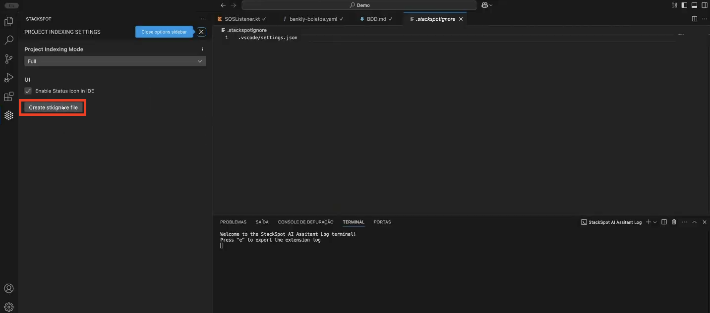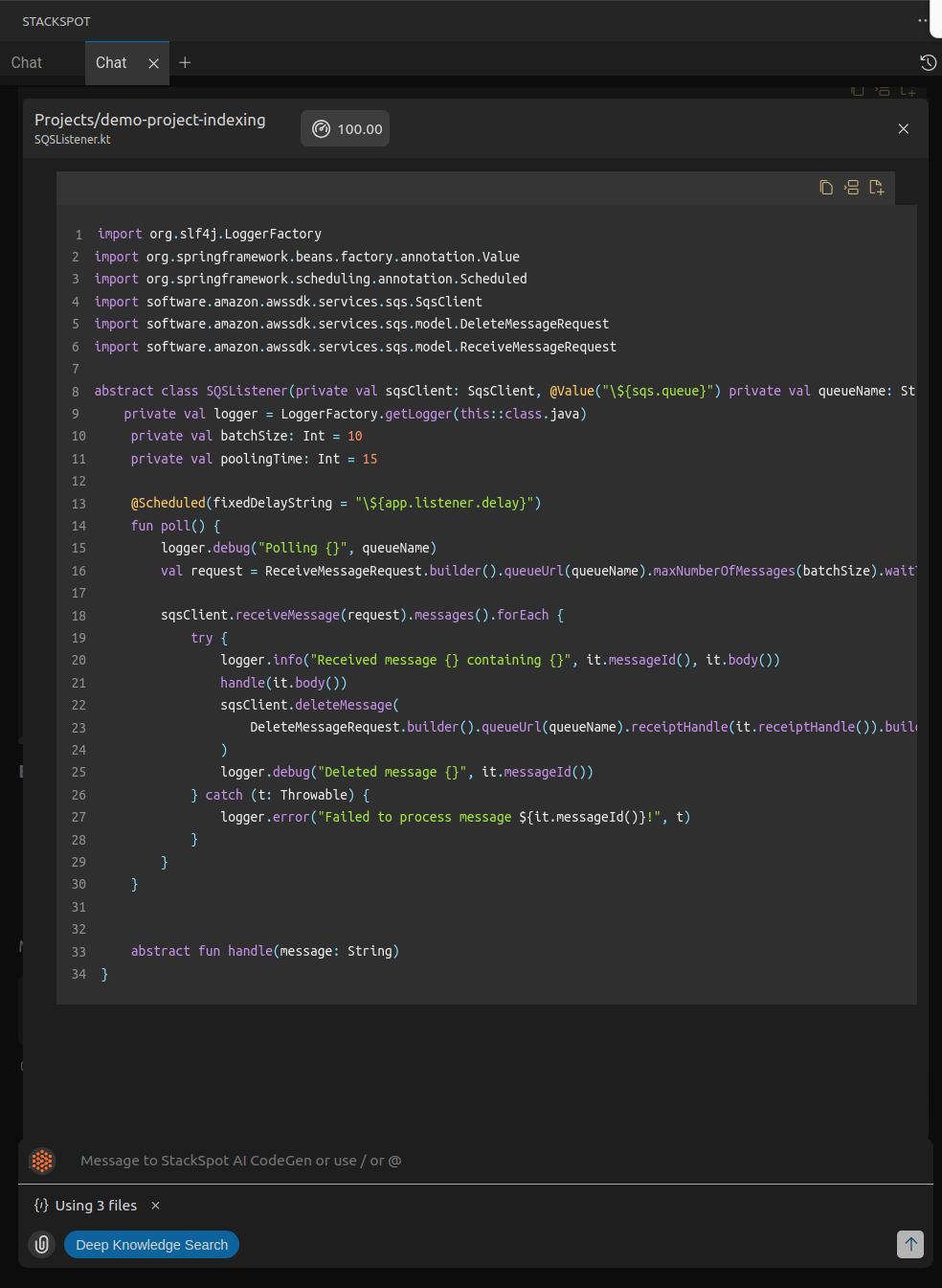 A StackSpot AI processará todos os arquivos no seu projeto aberto enquanto estiver neste modo. Para garantir o processamento adequado, a StackSpot AI ignora os arquivos listados nos arquivos .stktignore e .stackspotignored, que podem ser adicionados à raiz do seu projeto. Quaisquer alterações feitas nos arquivos deste projeto aberto serão indexadas em segundo plano.