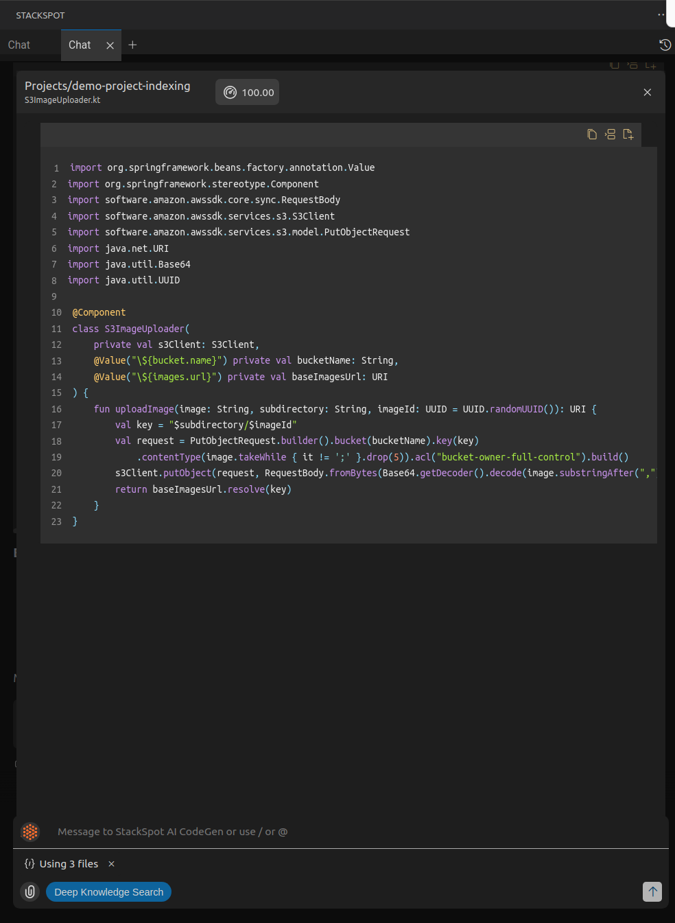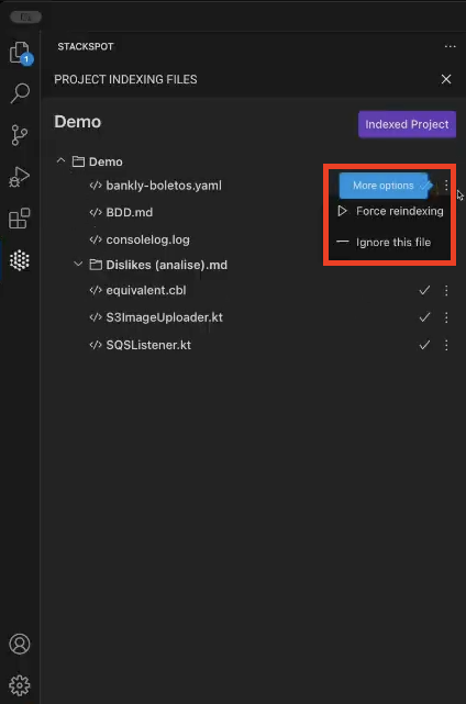 Se você enviar muitos arquivos para a StackSpot AI, o processo de indexação pode levar mais tempo. Aguarde até que a indexação seja concluída.