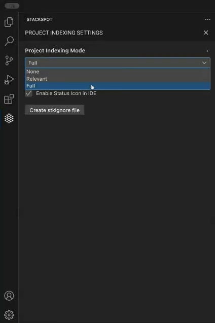 Você pode indexar arquivos para obter mais contexto ao usar a StackSpot AI. Quando você integra seu trabalho recente, a StackSpot AI pode fornecer sugestões de código relevantes e soluções adaptadas ao seu contexto. Existem dois modos:
