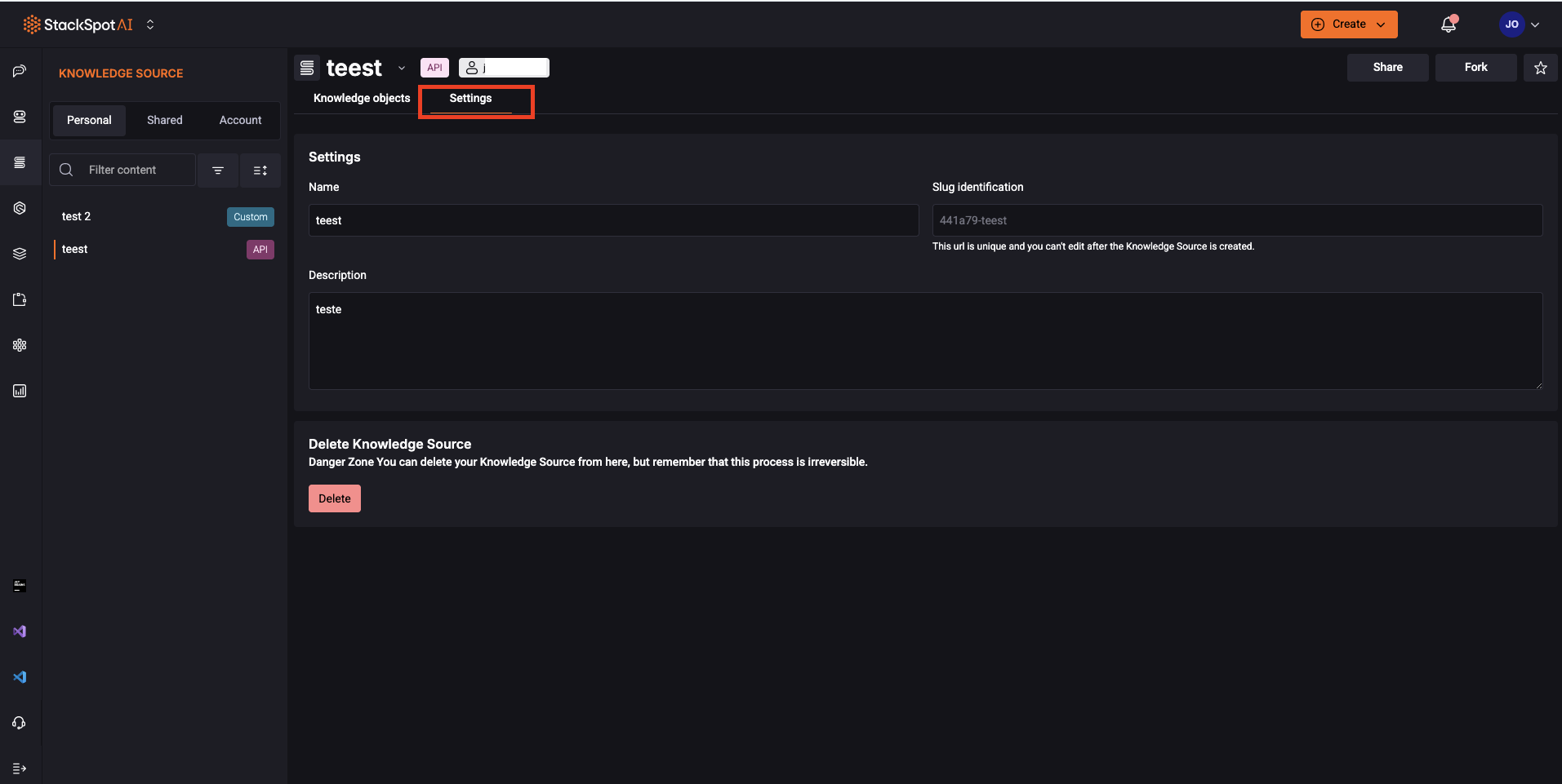 - Se desejar excluir o Knowledge Source, clique no botão 'Excluir Knowledge Source' no fim da página.