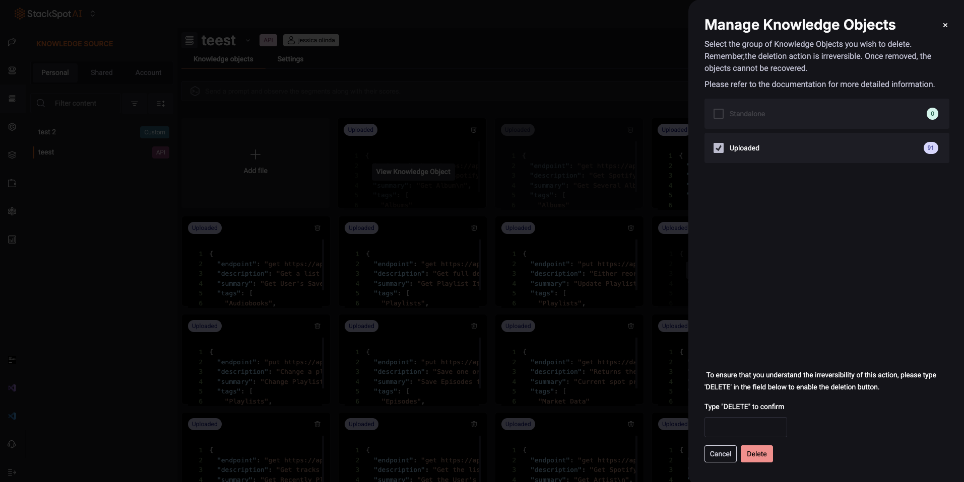 - Arquivo enviado: você excluirá todos os Knowledge Objects que carregou como arquivos.