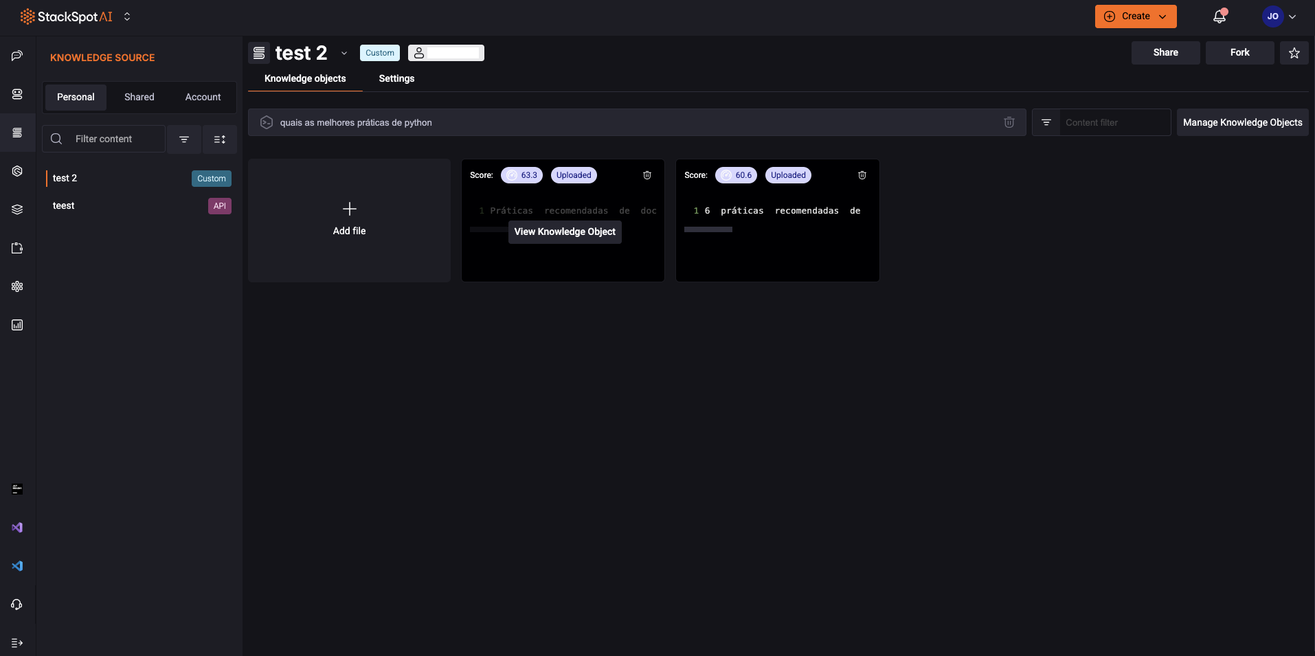 Agora você pode adicionar seus Knowledge Sources favoritos à IDE. Esse recurso simplifica o acesso aos Knowledge Sources que você mais utiliza, e você pode encontrá-los na aba Favoritos.