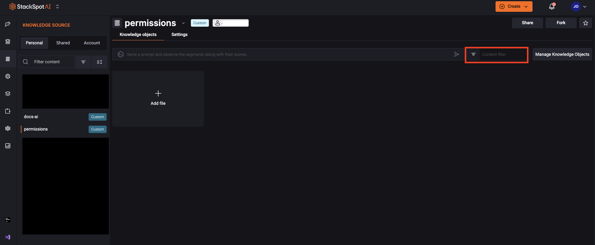 Passo 3. Clique no seu Knowledge Source. Existe uma caixa de busca localizada no lado direito da tela. Nessa caixa está escrito 'Filtro de conteúdo';