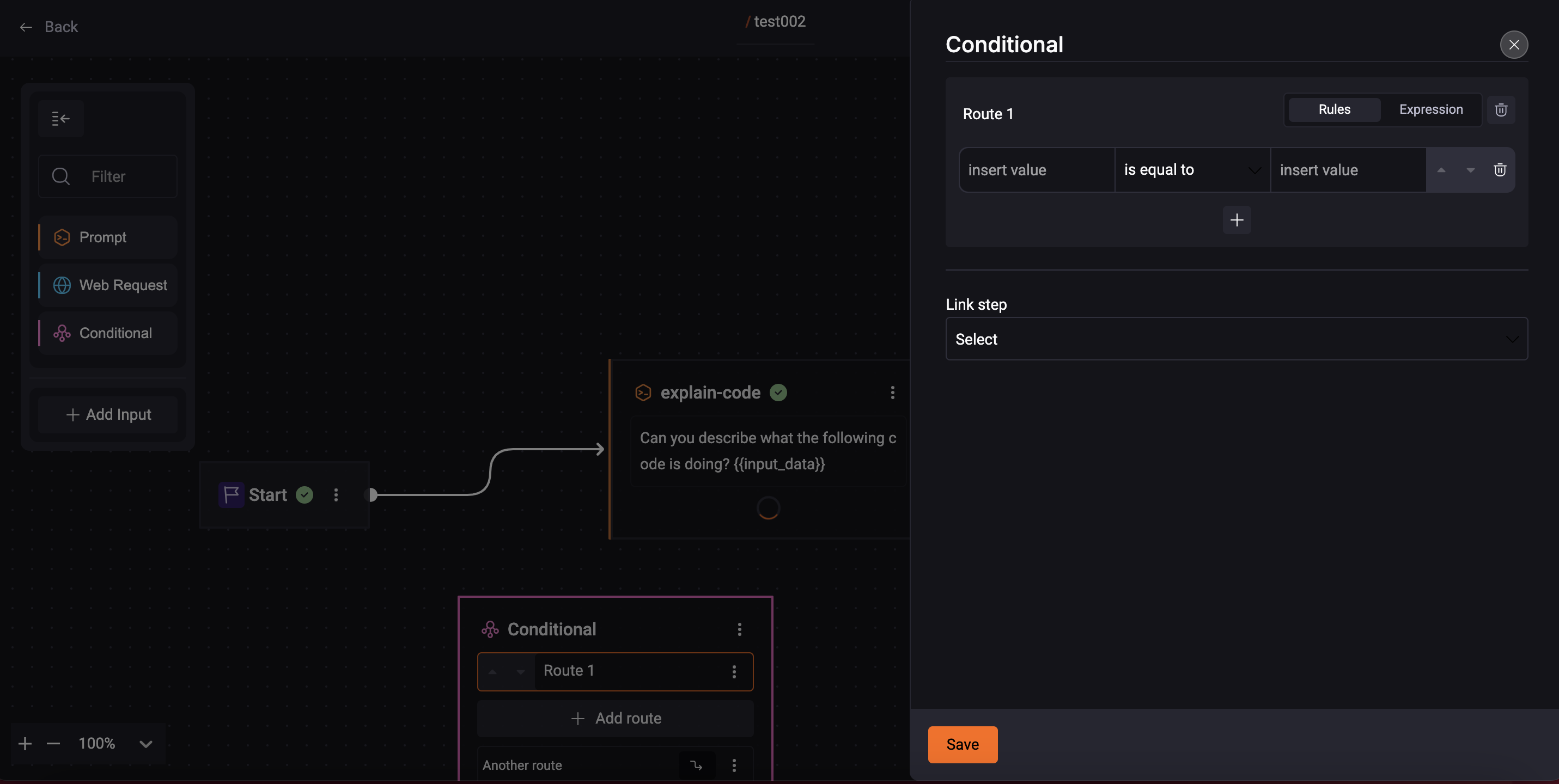 Você pode criar expressões de código com as rotas desejadas. Clique na aba Expressão para escrever suas regras. Você também pode solicitar que a IA gere expressões Jinja para você.