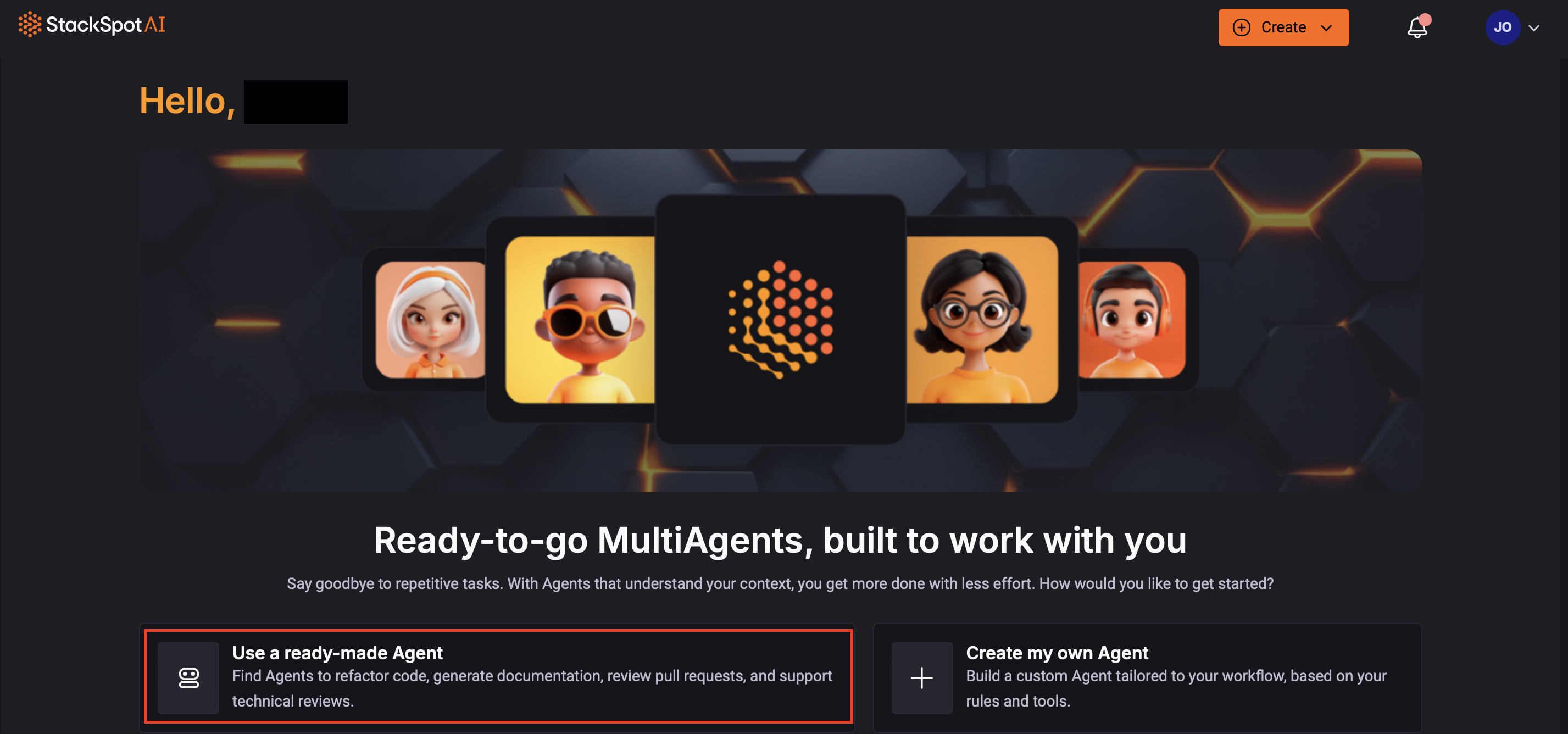 Na seção Agentes, você encontrará a subseção Pessoal. Nela, é possível criar seus próprios Agentes ou utilizar Agentes disponibilizados pela StackSpot AI.
